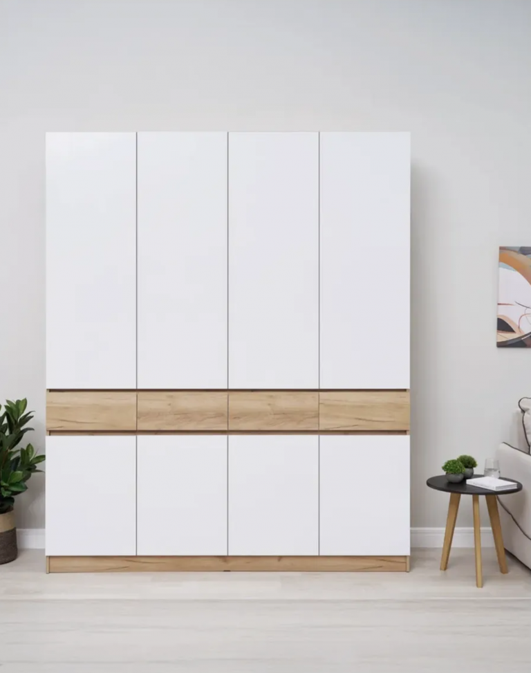 Шкаф для одежды Роджина 4-х створчатый выполнен в современном дизайне с белым глянцевым покрытием, которое добавляет свет и визуально увеличивает пространство. Высота 240 см позволяет эффективно использовать вертикальное пространство, обеспечивая достаточно места для хранения одежды, обуви и аксессуаров. Выполнен из высококачественных материалов ЛДСП, устойчивые к повреждениям и легкие в уходе. Цвет белый глянец, который легко сочетается с любым интерьером. Шкаф имеет просторные полки и штангу для одежды, что позволяет организовать пространство по вашему усмотрению.